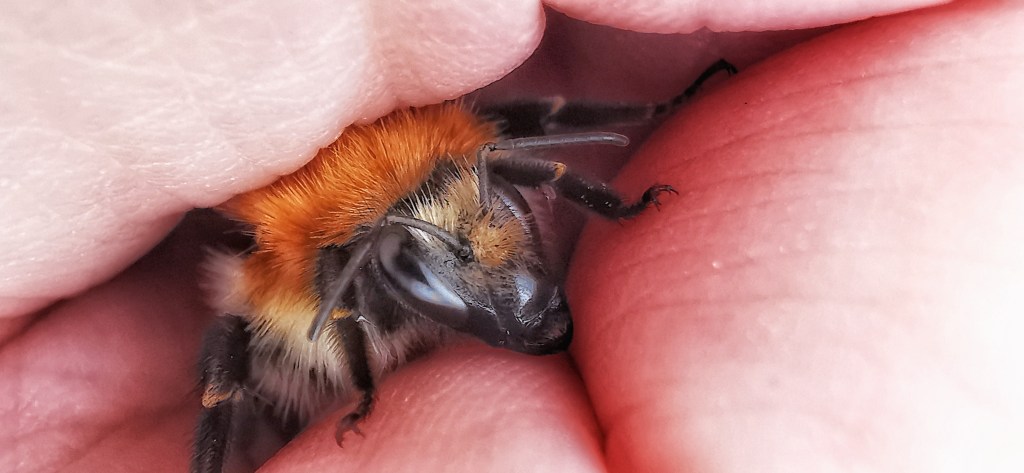 März, mein Mann und ich hofften auf einen tollen Frühlingsanfang. So das wir wieder öfters raus können. och der Frühling startete kalt und vor allem nass. Irgendwie wollte der Winter einfach kein Ende nehmen. Ansonsten war der März eher ereignislos. Dann kam der April und Frühling noch immer nicht in Sicht. War echt frustrierend. Mein Man ging ab und an mit seinem Bruder noch das kleine Grundstück mit kleiner Hütte für die neue Saison parat machen. Büsche, Bäume wollte geschnitten werden, Hütte putzen, Wasser wieder anstellen und so weiter. Aber wie gesagt, es war zum teil echt scheiss kalt. Noch immer liefen wir mit Winterjacke und Boots rum. Und für mich startete die Ergotherapie. Man war ich die ersten paar mal Nervös aber was ich toll fand, ich konnte zu Fuss dahin gehen. Ich hatte das Glück das ich erst mal it Einzelsitzungen starten konnte, da ich mich mit fremden Menschen echt immer sehr schwer tu. War schon eine Herausforderung dahin zu gehen und mich an eine neue Therapeutin zu gewöhnen. Dennoch, ich hab mir fest vorgenommen das zu packen und alles zu tun um weiter zu kommen. Nach der 3. Therapiestunde, also auf dem Heimweg, es war immer noch ziemlich kalt, fand ich auf dem Fussweg eine kleine Hummel am Boden. ih hob sie auf und schaute ob sie noch lebte. Sie bewegte sich kaum und so hab ich sie in meine Hand genommen und sie ein Stückweit mit genommen in der Hoffnung durch meine Wärme würde sie wieder munter werden.