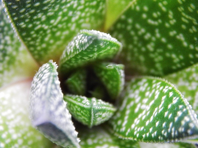 Wie auf dem Foto unschwer zu erkennen sind die Blätter fleischig, dunkelgrün und weisen eine lanzettenartige, zugespitzte Form auf und laufen in grannenartigen Borsten aus. Auf der Oberseite der Blätter sind viele weiße Flecken zu erkennen: In der Nähe der Basis sind sie leicht erhöht, zur Spitze hin werden sie stacheliger. Auf der unteren Blattseite sind die Flecken so dicht angeordnet, dass sie manchmal als Bänder erscheinen. An den Rändern der leicht gebogenen Blätter sitzen ein bis zwei Millimeter lange weiße Zähne.