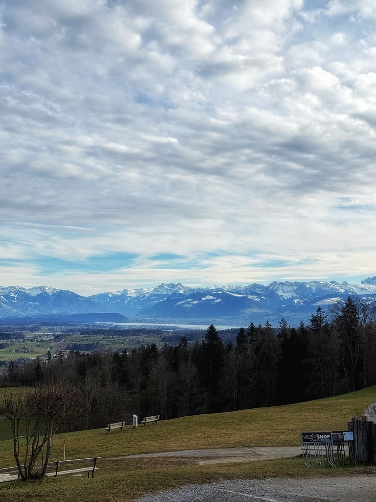 Dann sind wir weiter gefahren und haben uns auf den Weg gemacht, rauf zum Aussichtspunkt. Aber auf dem Weg rauf sind wir an einer Bank vorbei gekommen und haben uns dahin gesetzt, denn die Sonne schien so schön und sie wärmte nicht nur genug um mich meines Mantels zu entledigen, sondern um wirklich die Wärme aufzusaugen. Und der Blick auf die Schweizer Alpen war einfach fantastisch…